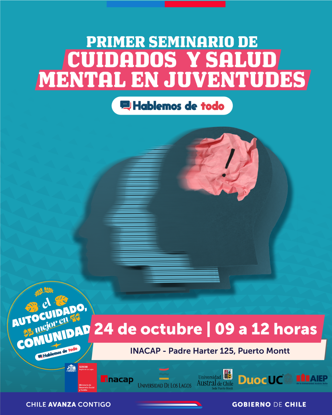El Instituto Nacional de la Juventud (INJUV) invita a participar en el Seminario “Cuidados y Salud Mental en Juventudes”, que se realizará el viernes 24 de octubre de 2025, de 09:00 a 12:30 hrs., en el Salón Auditorio de INACAP, sede Puerto Montt.