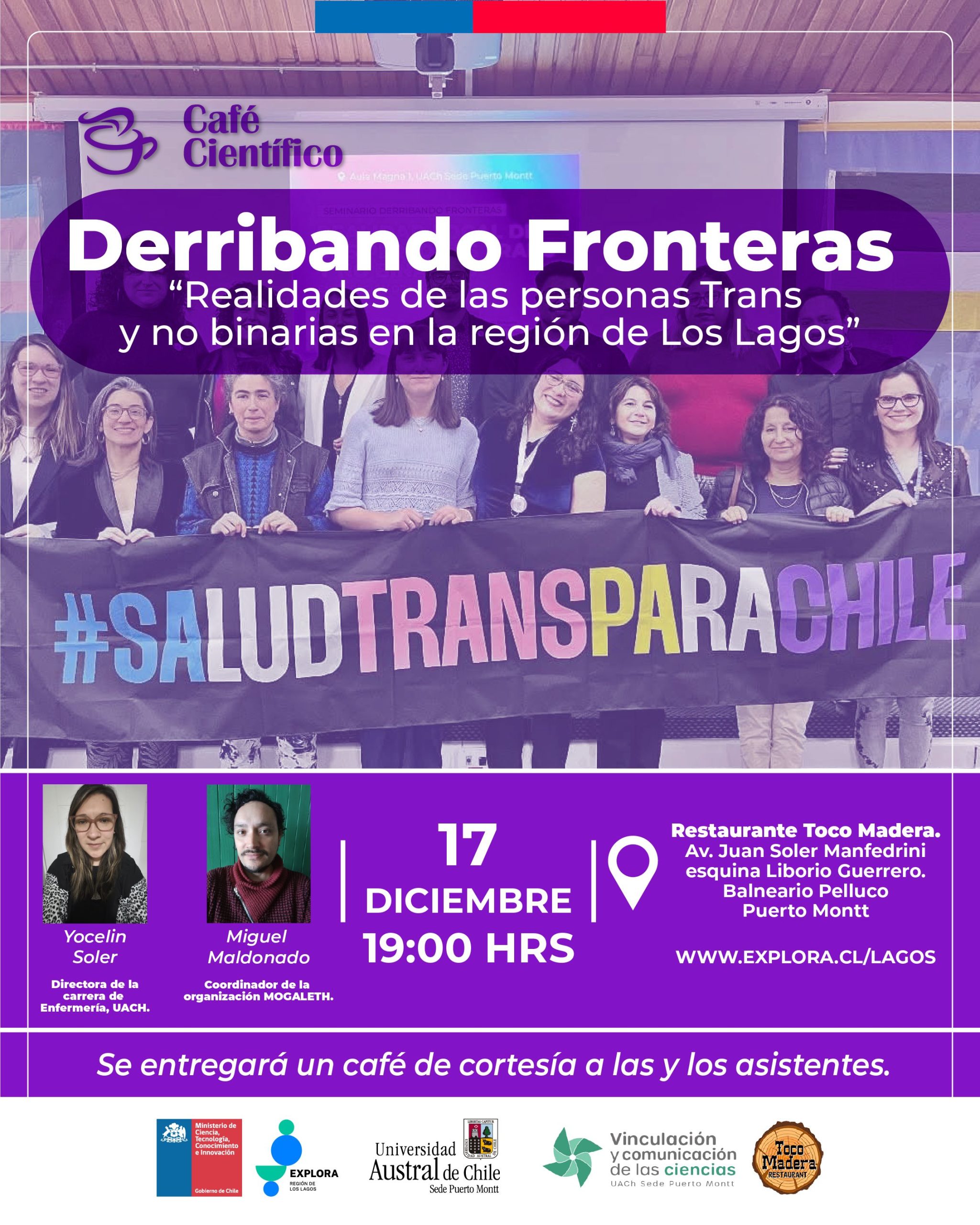 Para conocer y conversar en torno a los resultados del proyecto de investigación-acción colaborativo UACh-MOGALETH «Derribando Fronteras», el Proyecto Asociativo Regional (PAR) Explora invita a la charla “Derribando Fronteras. Realidades de las personas Trans y no binarias en la región de Los Lagos” que se realizará al alero del Café Científico de Puerto Montt, el próximo miércoles 17 de diciembre a las 19:00 horas, en el restaurante Toco Madera.