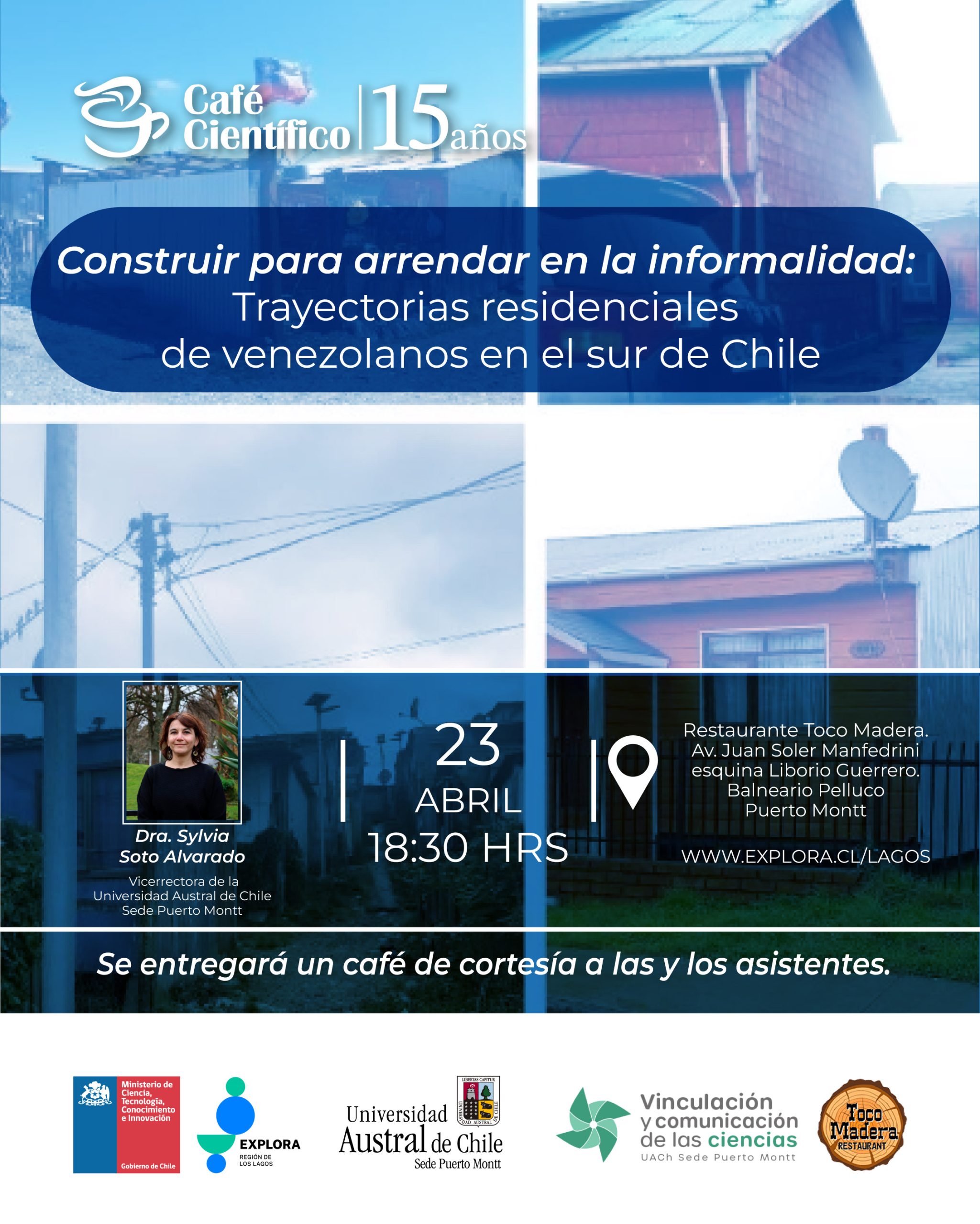 El Café Científico de Puerto Montt es una iniciativa del PAR Explora Los Lagos, del Ministerio de Ciencia, Tecnología, Conocimiento e Innovación, ejecutado por la Universidad Austral de Chile Sede Puerto Montt, a través de su Unidad de Vinculación y Comunicación de la Ciencia, con el apoyo del Restaurant Toco Madera y la Casa de las Artes de esta casa de estudios superiores.