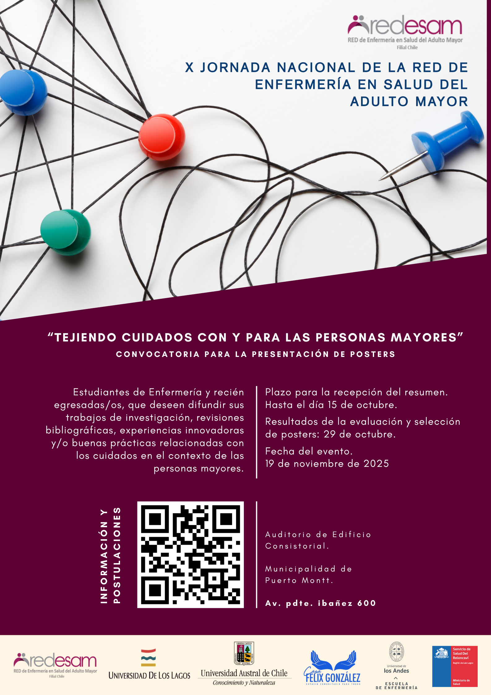 La ciudad de Puerto Montt será el punto de encuentro nacional para profesionales, estudiantes e investigadores del área de la enfermería con la realización de la 10ª Jornada Nacional de la Red de Enfermería en Salud del Adulto Mayor (REDESAM), actividad que este año se desarrollará bajo el lema “Tejiendo cuidados con y para las personas mayores”.