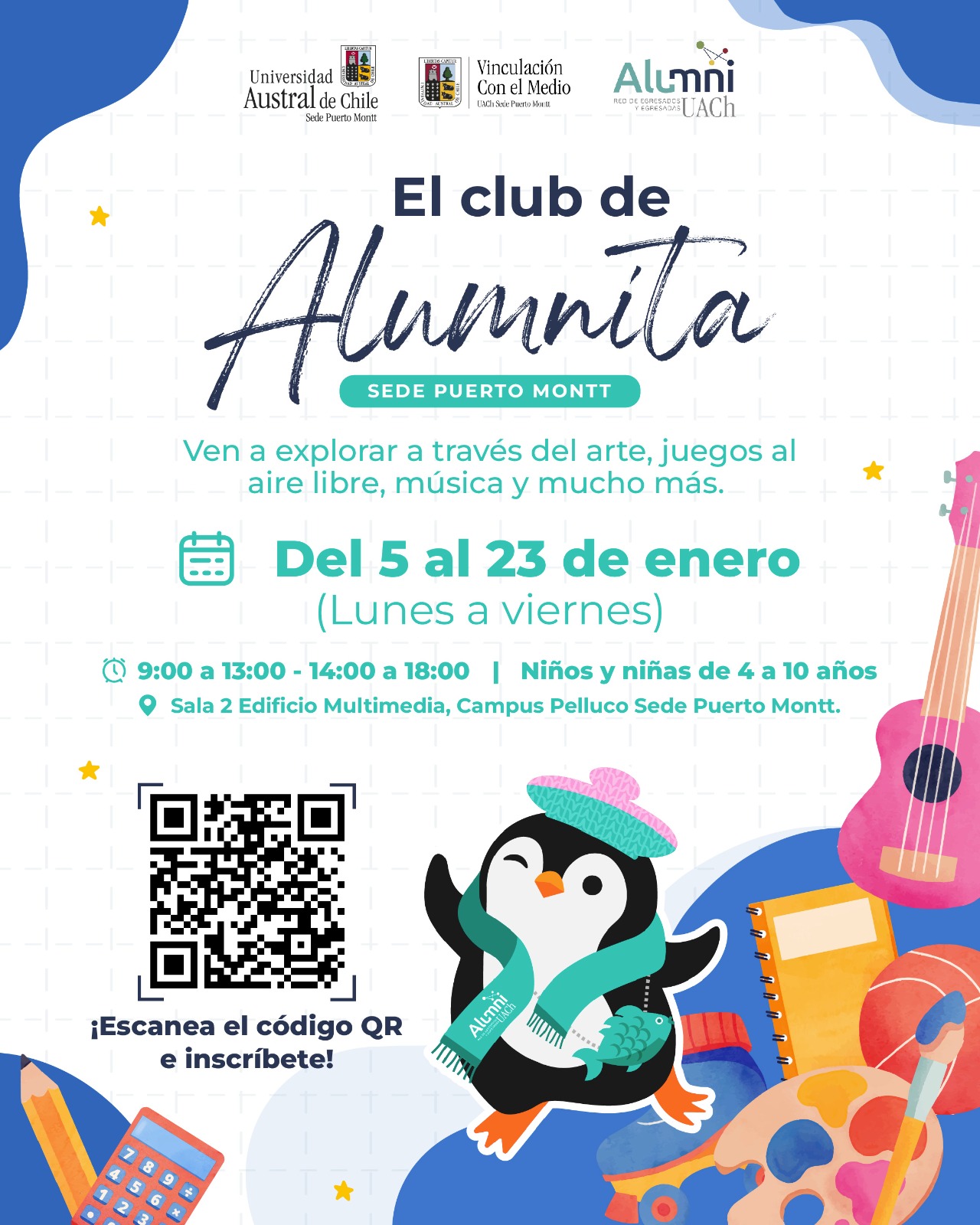 La Universidad Austral de Chile Sede Puerto Montt invita a la comunidad universitaria y regional a participar en una nueva versión del Club de Alumnita Verano 2026, iniciativa dirigida a niños y niñas de 4 a 10 años, que busca ofrecer un espacio seguro, educativo y recreativo durante el período estival. La iniciativa está abierta tanto a familias pertenecientes a la comunidad UACh como a familias externas.